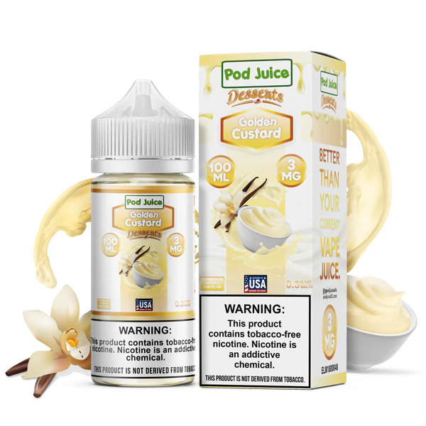 Indulge in the rich and creamy flavor of Pod Juice's Golden Custard, a 3mg 100ml Freebase e-liquid that will tantalize your taste buds. This sweet and fragrant blend of custard and vanilla is sure to satisfy your cravings. With a perfect balance of Vegetable Glycerin, Propylene Glycol, Nicotine, and Natural & Artificial Flavors, this e-liquid is a must-try for free-base users.